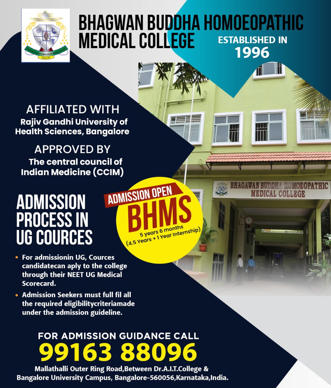 Established on 1996, Bhagwan Buddha Homeopathic Medical College Bangalore Karnataka is recognized by the Central Council Of Homeopathy, Govt. Of India New Delhi. Affiliated to RGUHS Karnataka and approved by the Department of AYUSH. The college is managed by Buddha Education and Trust. The Institute offers undergraduate course for Bachelor of Homeopathic Medicine and Surgery (B.H.M.S).